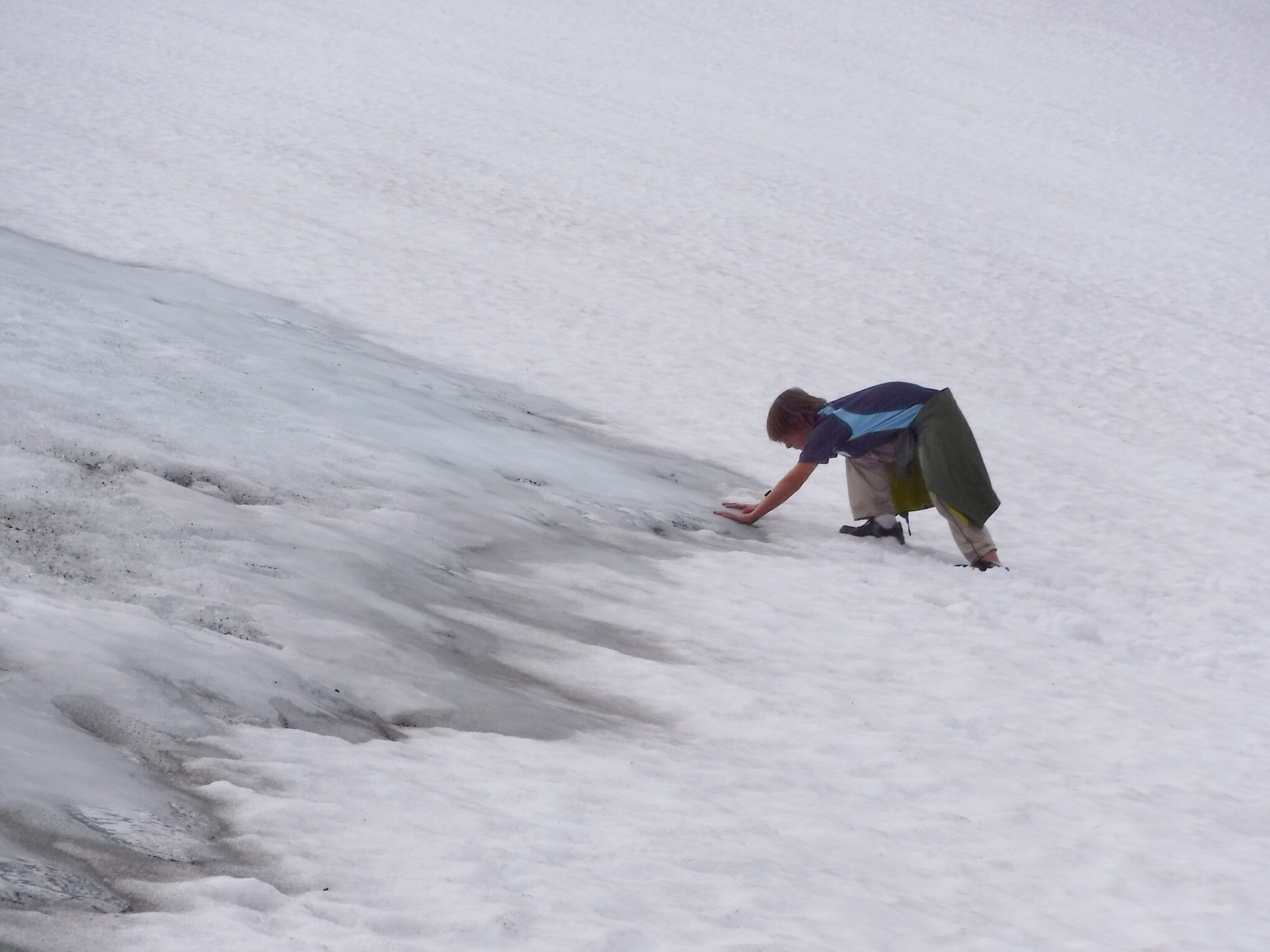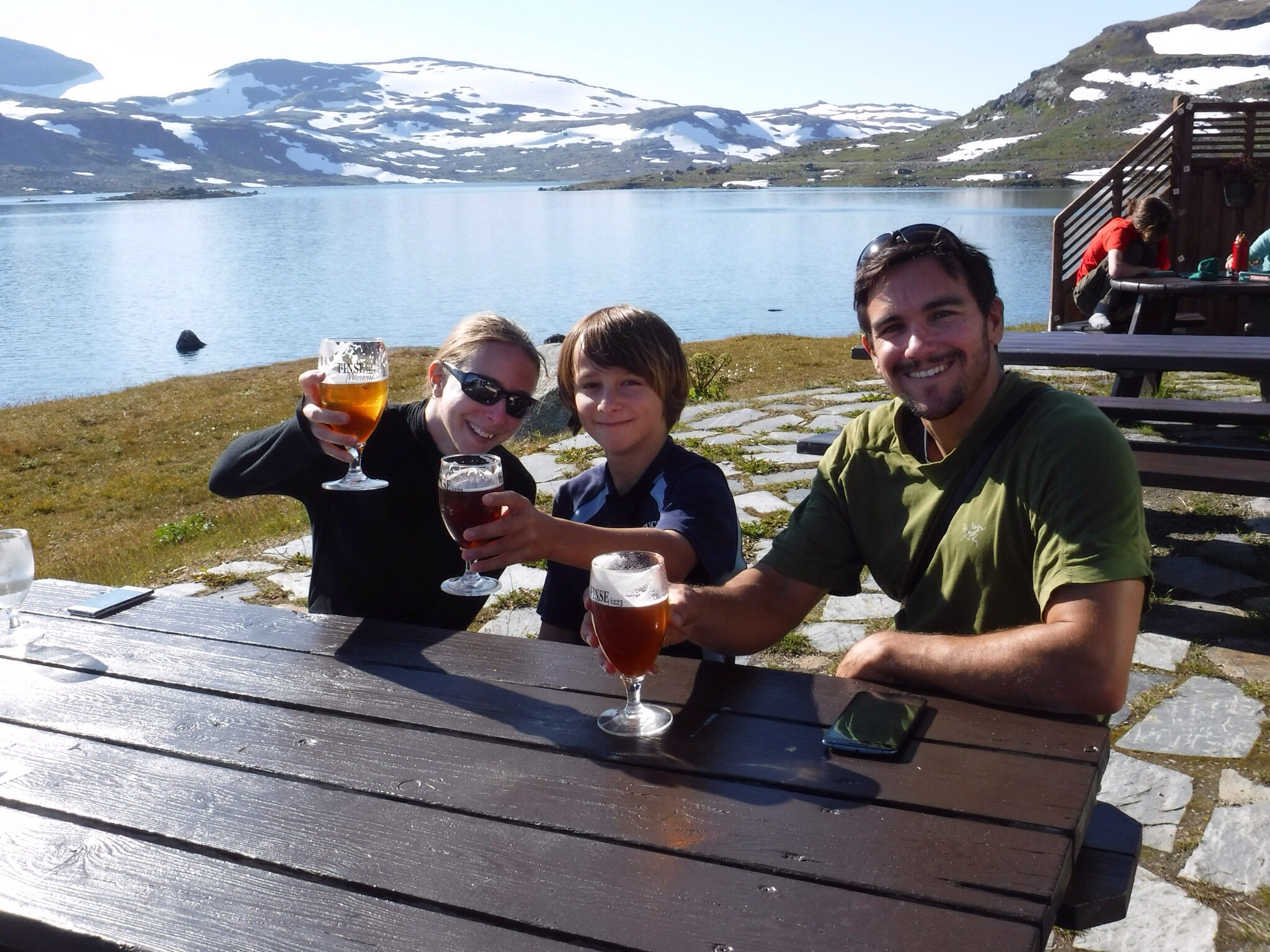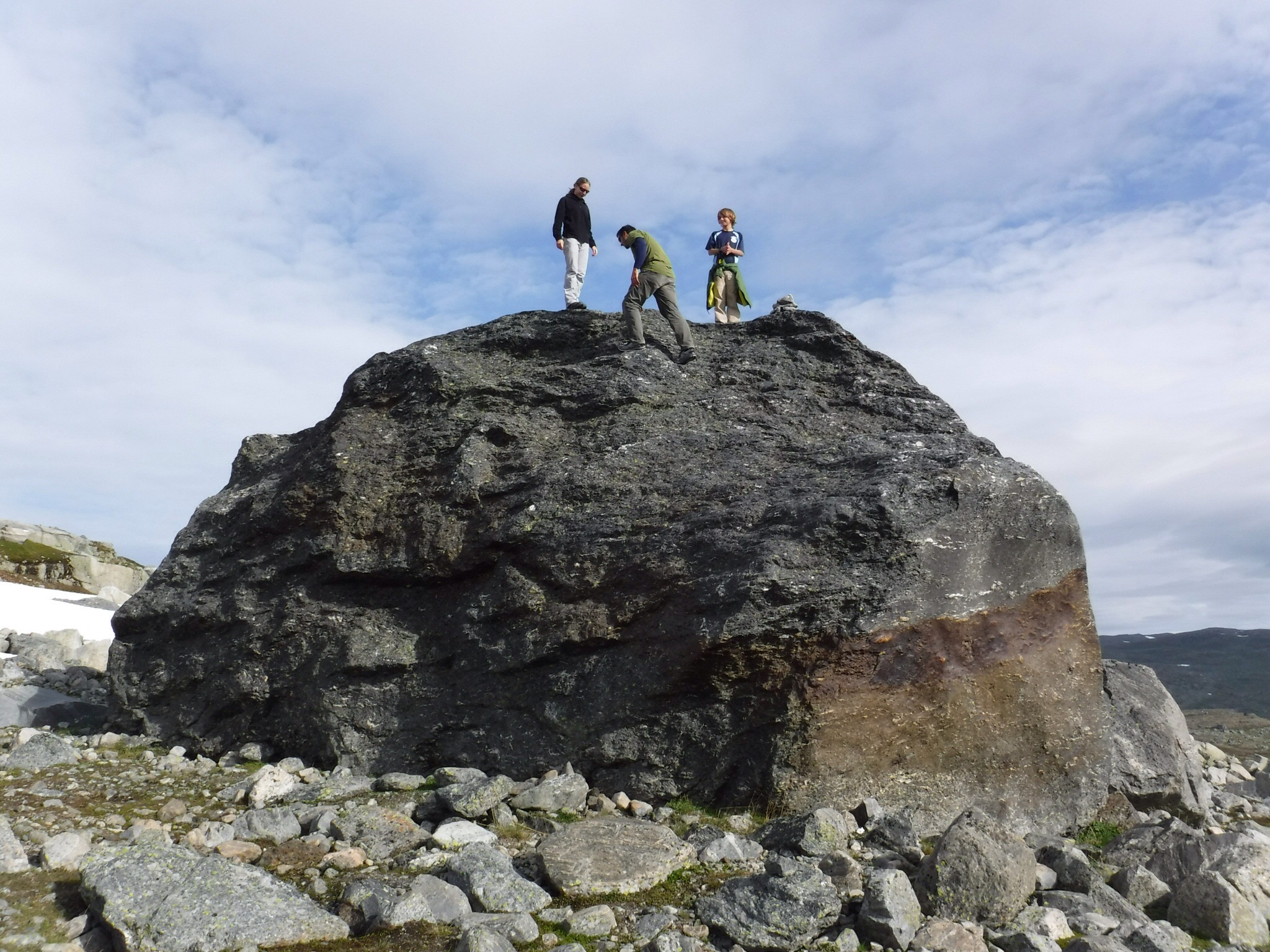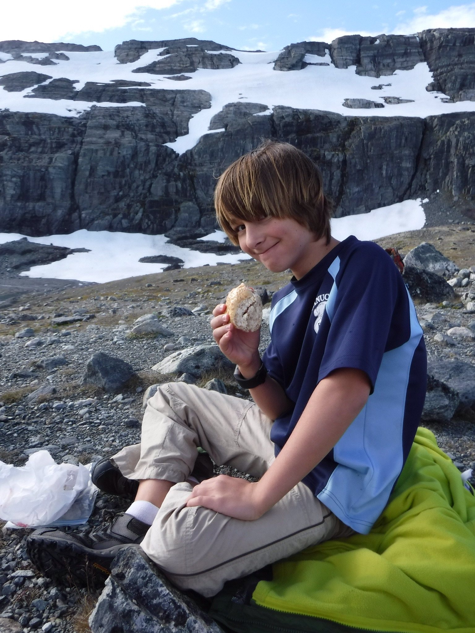 Breakfast and lunch making was at 8:00. The breakfast part of the meal was very good. I had eggs, bread, waffles, juice, and sausages. My favorite part of the meal was the waffle because I put tons of jam on it and ate it with my hands. The lunch part of the meal was making sandwiches for when it was lunch and we were somewhere in the mountains. The bread that was available was the kind that is really puffy and can absorb lots of liquid, so one of my sandwiches was with lots of jam and the other was meat and cheese. The decision for where we were going to walk was up to part of the glacier, commonly referred to as Blue Ice because it’s right at the end of a glacier tongue and it’s still blue! We got to cross a ‘dam’ that held back the water from the lake so it didn’t all flow down the river and create a flood, even though the lake was very shallow. While walking we played leapfrog with two backpackers, either they wanted to stop or we were slow because my mum wanted a picture, and we kept bumping into them all of the way. At the end, we became friends and we have a lot of pictures to send each other when we get home. Their names are Jason and Lucille. One third of the way there Jason and Lucille climbed a big rock that was deposited by a glacier and they invited me up, I couldn’t get up on my own so they helped me. A little past the rock, we had to cross a river by a small flimsy no sided wooden bridge and my mum totally freaked out and took about 30 seconds getting across itπ. When we finally came into view of the glacier, it wasn’t very cool, just your average glacier. What was cool, was that Jason went up the snow by the glacier and slid down it standing up. I slid down a lot too, but not standing up. Lunch was good, and after it I made a cairn, a big pile of rocks. It felt like walking back to the Finsehytta was a lot faster than walking to the glacier, even though we went the same route both ways. Dinner was a lot louder than the night before because a school group had arrived, I guess they do the trip to get out into the mountains for a field trip. After dinner they became VERY rowdy, the worst part of it was when they started running around on the rooftopπ³! We were up very late, me on the iPad and my mum was talking to someone.